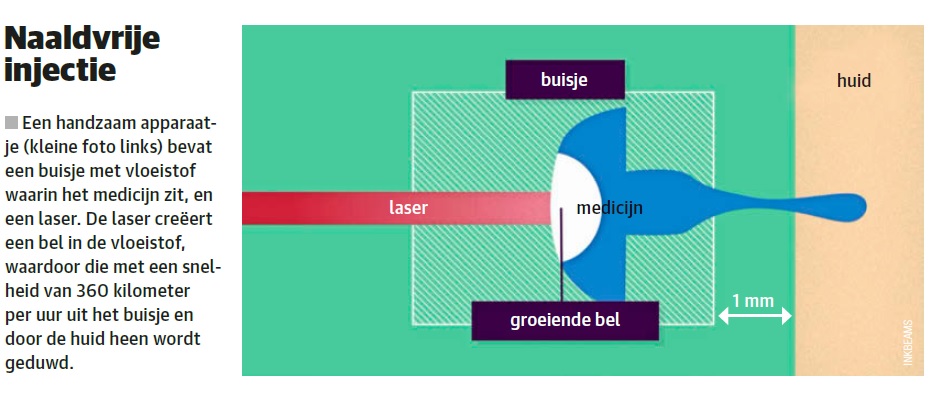“We gebruiken de energie van een kleine laser die continu licht uitzendt. In een handzaam apparaatje stoppen we een buisje met vloeistof plus zo’n laser, die op het buisje staat gericht. Dat apparaatje houden we dan op de huid van de patiënt. Door de interactie met de laser ontstaat er een gasbubbel die de vloeistof met een snelheid van 360 kilometer per uur door het open uiteinde van het buisje drukt. Die snelheid is hoog genoeg om een straal vloeistof direct door de opperhuid heen te laten dringen.”