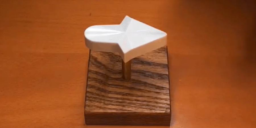 Voor deze illusie (en andere) heeft Sugihara met zijn wiskundig inzicht, slim gebruik gemaakt van spiegeling en perspectief. Als je het voorwerp van boven bekijkt, zie je dat de ‘pijl’ gek genoeg symmetrisch is. De inkepingen in de bovenkant zorgen ervoor dat vanuit een andere hoek – de hoek die in het filmpje te zien is – je brein gefopt wordt en de ene kant meer puntvormig te lijkt dan de andere kant.