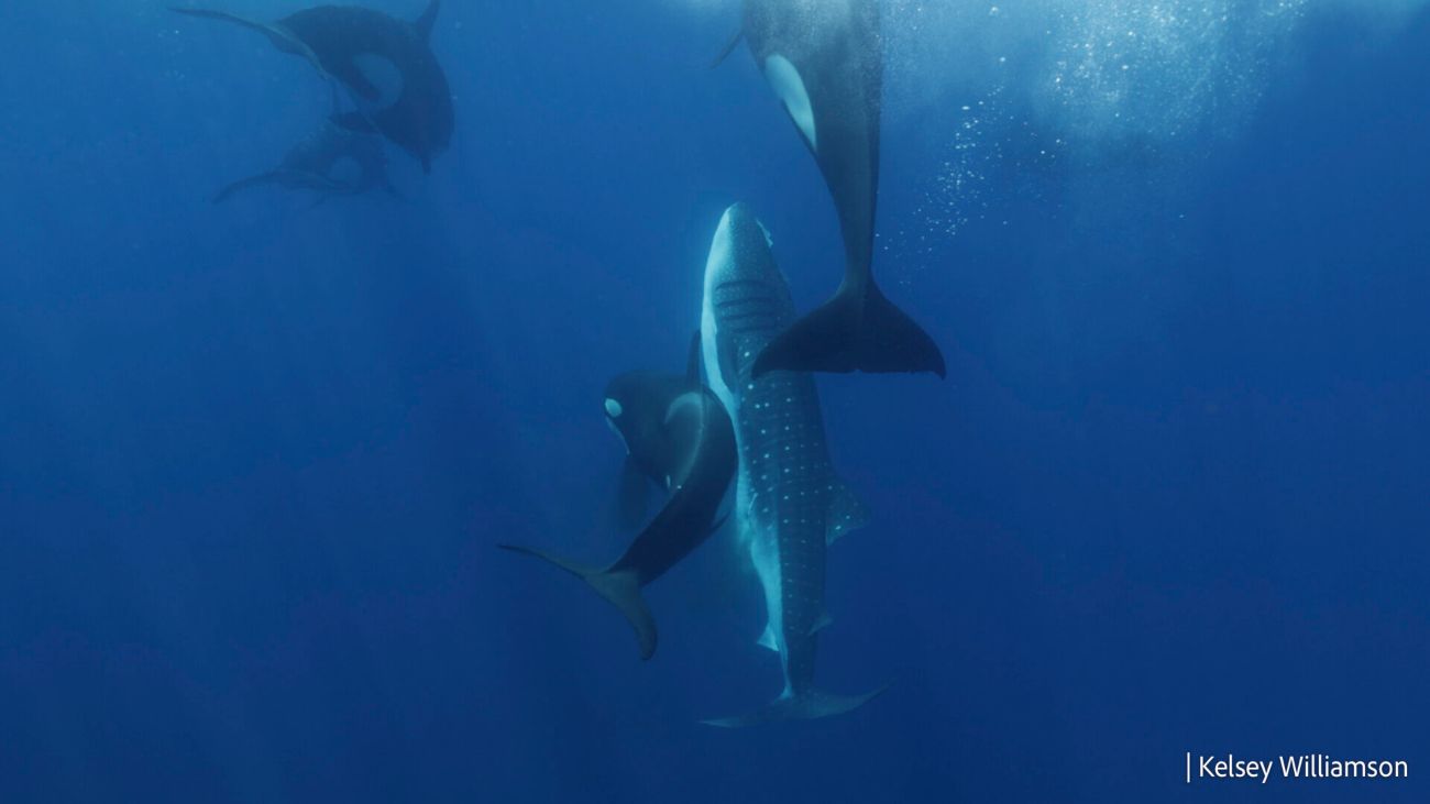 Foto’s en video’s onthullen hoe een troep orka’s op een brute manier op walvishaaien jaagt, de grootste vissoort ter wereld.