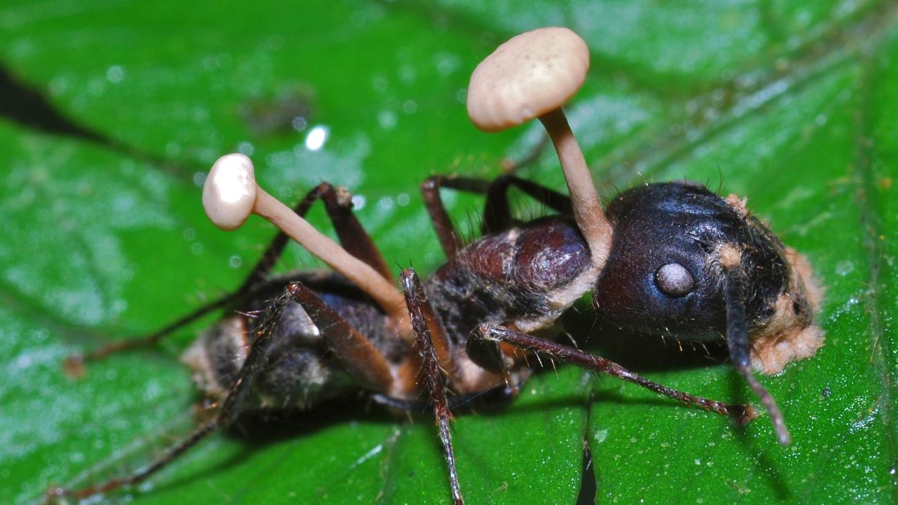 Eerder dit jaar werd in Noord-Ierland een nieuwe zombieschimmel ontdekt. Gibellula attenboroughii, zoals de onderzoekers hem noemden, manipuleert het gedrag van spinnen in grotten. Ze verlaten hun web of schuilplaats om op een onbeschutte plek te sterven. En dat is voordelig voor de schimmel, want sporen kunnen zo makkelijker een volgend slachtoffer bereiken.