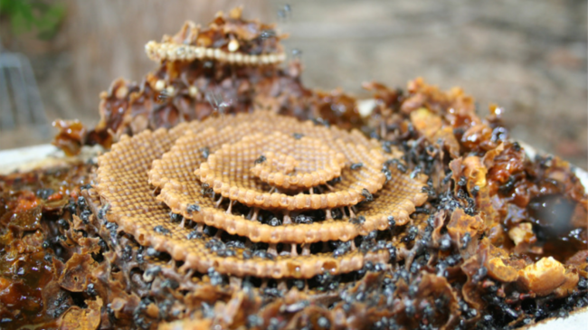 De Australische steekloze bij (Tetragonula carbonaria) doet daar nog een schepje bovenop. In plaats van de gebruikelijke honingraat, bouwen deze beestjes hun kraamkamers in de vorm van een indrukwekkende spiraal. Om de stevige broedcellen te bouwen scheiden de werksters een speciale waxsubstantie uit en mixen deze met hars tot een stevig materiaal.