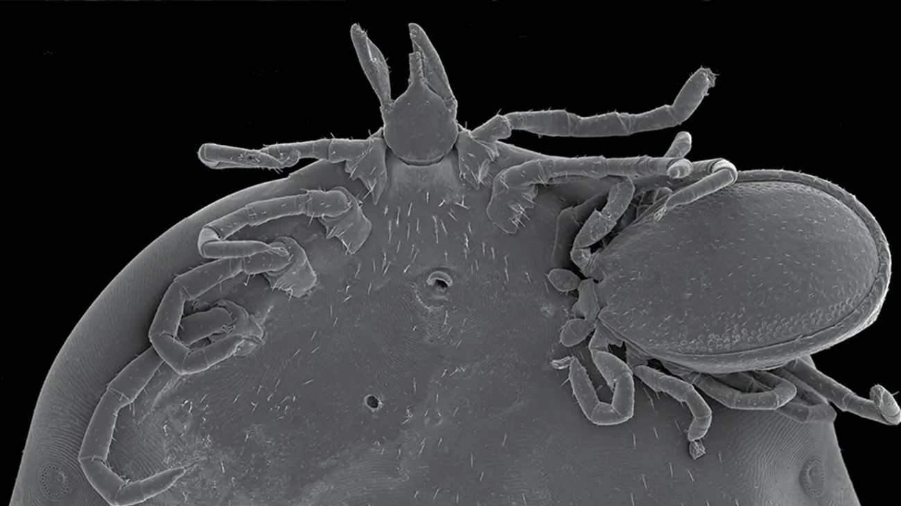 De foto laat een vrouwelijke teek zien die van een eekhoorn verwijderd is. Met een microscoop zagen wetenschappers dat een mannelijke teek zich onder het vrouwtje had vastgebeten, en zo een deel van de maaltijd pikte. Ook zijn er littekens te zien op het onderlichaam van het vrouwtje. Dit is dus niet de eerste keer dat deze parasiet een koekje van eigen deeg te verduren krijgt.