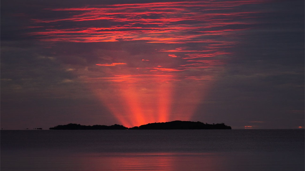 Je hoort wel eens dat een zonsondergang een van de mooiste dingen op aarde is, maar deze foto bewijst dat de echte schoonheid pas daarna komt. Deze zogeheten schemerstralen zijn afkomstig van de zon die al achter de horizon is verdwenen. Als de lucht dan veel aerosolen (kleine vochtdruppels) bevat, filteren die al het blauwe licht weg en blijft alleen een rode gloed over.