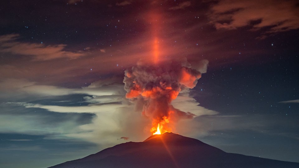 Vulkaanuitbarstingen leveren al te vaak spectaculaire foto’s op. Maar dit kiekje van Giancarlo Tinè is wel heel bijzonder. Boven de vulkaan zie je een lichtzuil: een optisch verschijnsel dat zich als een langwerpige schittering boven of onder een lichtbron lijkt uit te strekken. Vaak kun je dit soort zuilen zien met zonsop- en ondergang. Het fenomeen wordt veroorzaakt door kleine ijskristallen in de lucht. Deze minuscule spiegeltjes weerkaatsen zonnestralen tot een uitgerekte pilaar.