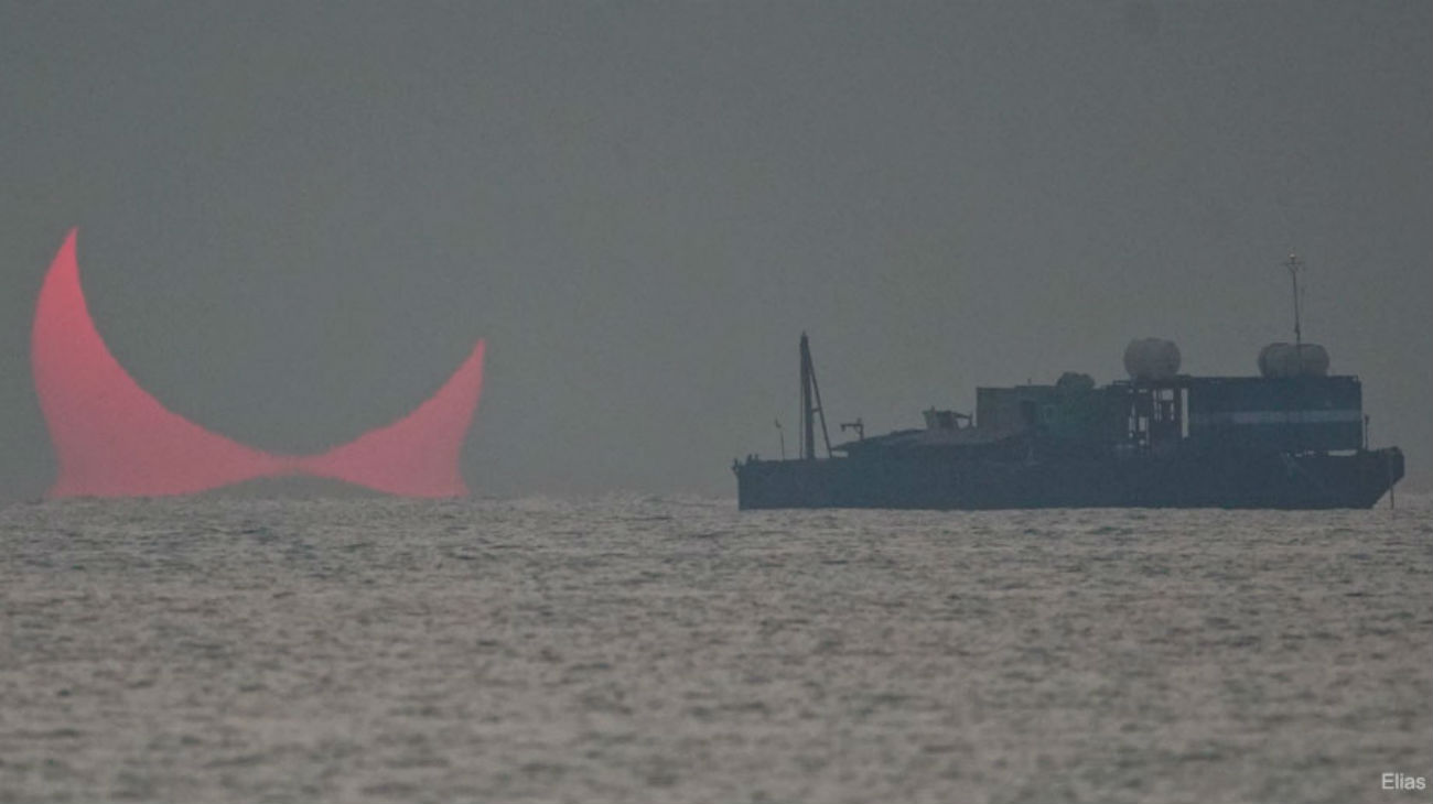 Als snel was de vergelijking met een paar duivelse hoorns gemaakt. De donkere cirkel aan de bovenkant van de rode zon is de maan, maar je ziet ook nog het begin van een cirkel aan de onderkant. Ook dat is de maan. Dit spiegeleffect wordt veroorzaakt door een zogeheten inversielaag, waarbij een warmere luchtlaag als een deken op een koudere laag ligt.
