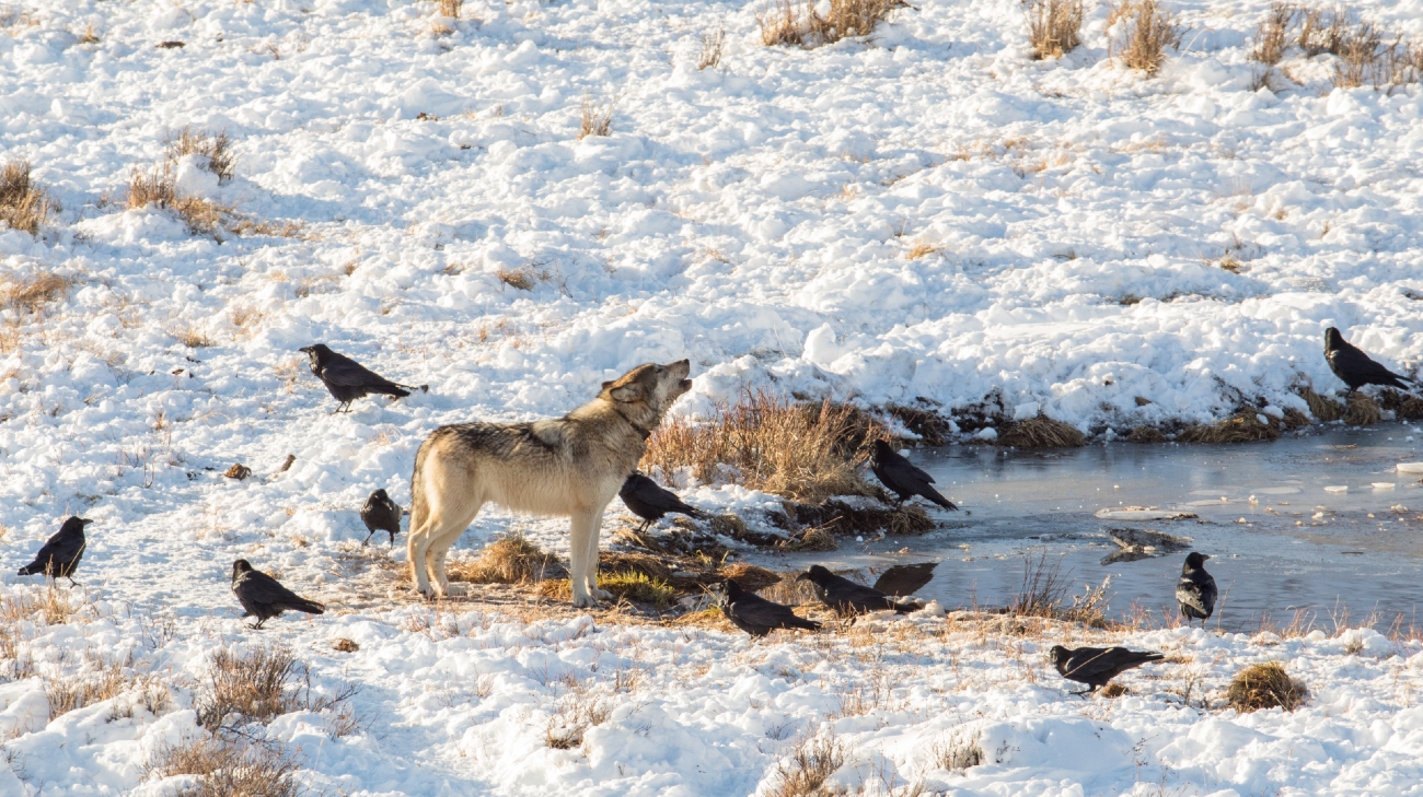 Wolven vangen een prooi en raven weten precies waar die kans het grootst is, om zo ook een graantje te kunnen meepikken.