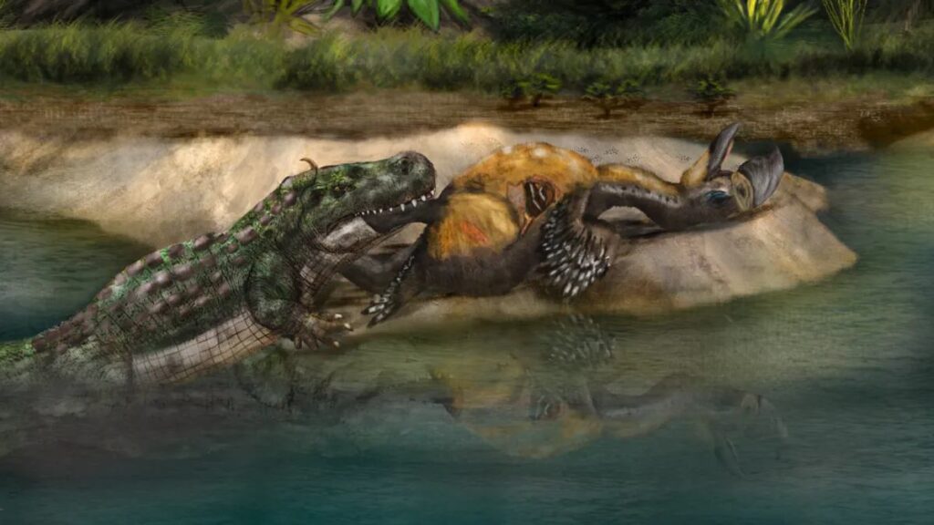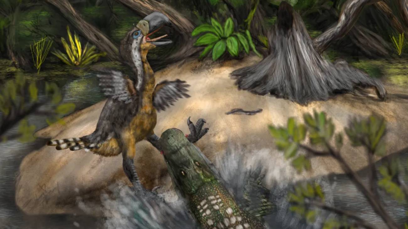 De uitgestorven kaaiman lag waarschijnlijk doodstil aan de rand van het water, wachtend op een prooi. Toen de schrikvogel voorbijliep, mogelijk om te drinken bij het water, kwam hij plotseling in beweging – vergelijkbaar met hoe krokodillen en kaaimannen tegenwoordig jagen.