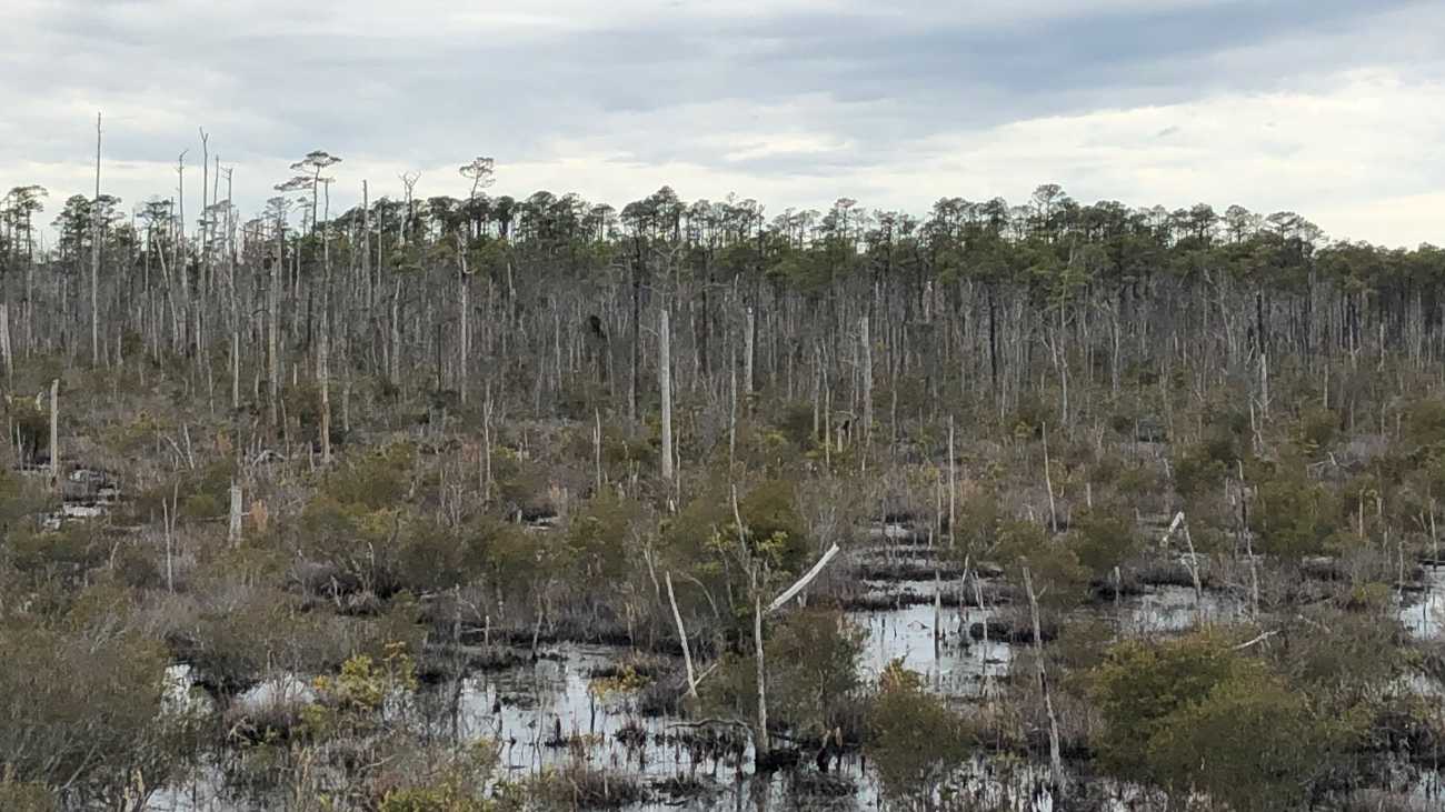 Hoewel moerascipressen duizenden jaren oud kunnen worden, gaan er in North Carolina veel vroegtijdig dood doordat zout zeewater de moerassen binnendringt. De bomen verliezen daardoor hun schors en veranderen in bleke, bladerloze boomstronken. Uiteindelijk zal de wind ze omverblazen waarna struiken eroverheen groeien, maar tot die tijd noemen wetenschappers deze gebieden ‘spookbossen’.