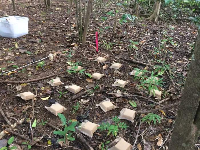 Om te testen hoe termieten het doen in bossen met jonge bomen, plaatsten de onderzoekers blokken hout in drie verschillende bossen. De eerste locatie was in een oerbos, de andere twee in bossen die respectievelijk 4 en 8 jaar geleden zijn herplant.