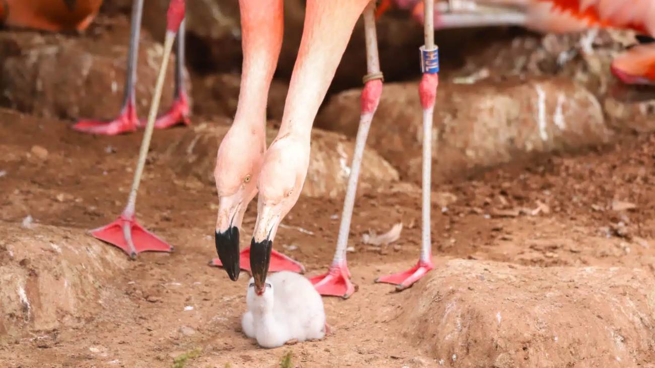 Twee mannetjesflamingo’s in Paignton Zoo, een dierentuin in het Verenigd Koninkrijk, hebben met succes een ei uitgebroed.