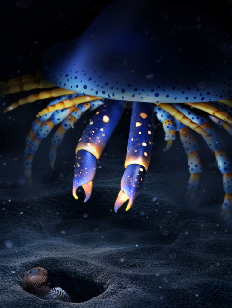 Een reconstructie van Megachelicerax cousteaui, de vroegst bekende gifkaakdrager