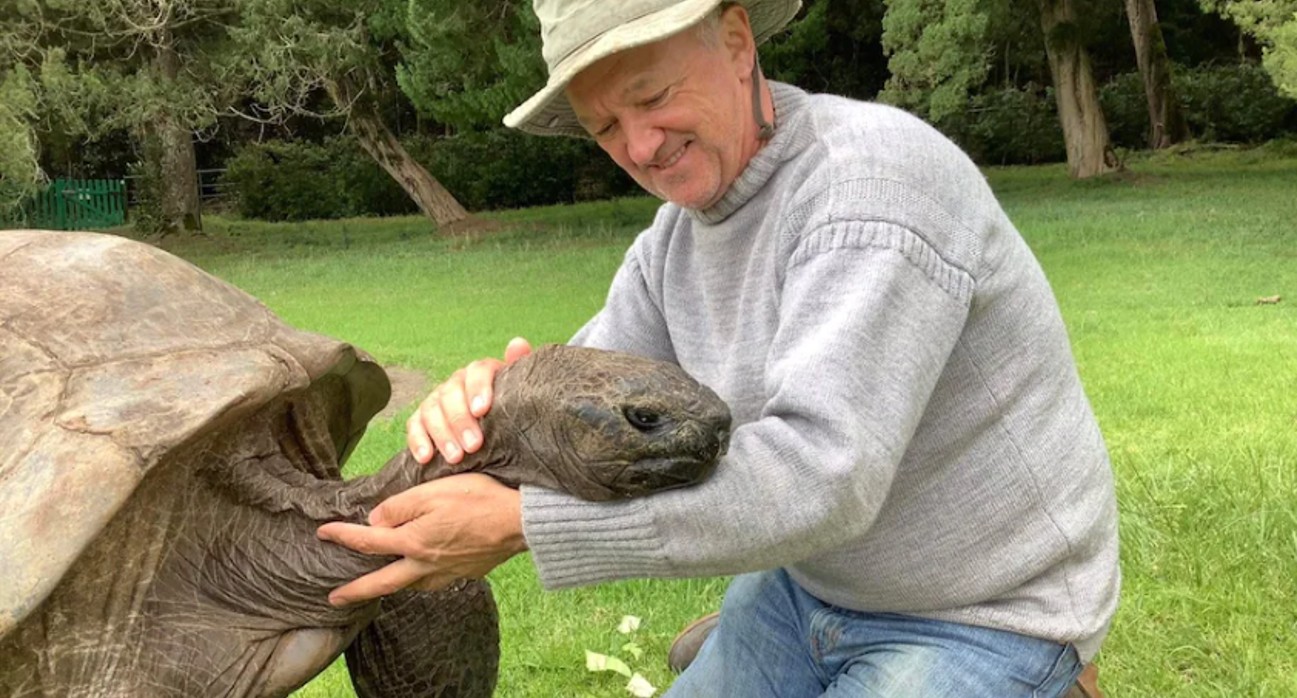 Beeld: Schildpad Jonathan met zijn verzorger Joe Hollins op St. Helena Island. © Tina Lucy