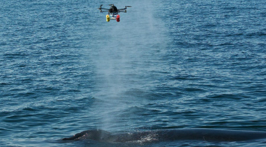Maar hoe ga je dat water opvangen? Je kunt moeilijk met een emmertje boven de enorme zoogdieren gaan hangen. Daarom worden drones ingezet die vlak boven walvissen moeten gaan vliegen om het spuitwater op te vangen.
