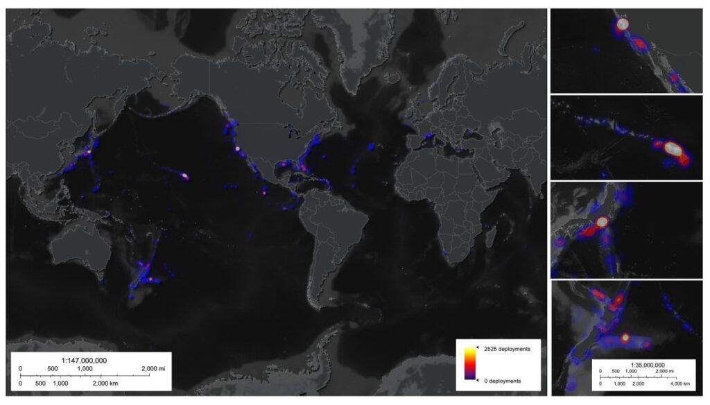 Daarnaast vond meer dan 65 procent van alle observaties plaats binnen 400 kilometer van de kust van de Verenigde Staten, Japan of Nieuw-Zeeland. En omdat diepzeeonderzoek enorm duur is, wordt het veld gedomineerd door slechts een handjevol landen. De VS, Japan, Nieuw-Zeeland, Frankrijk en Duitsland hebben samen 97 procent van alle waarnemingen gedaan. Onze kennis over de diepzee is dus gebaseerd op een ongelooflijk kleine en niet-representatieve steekproef.