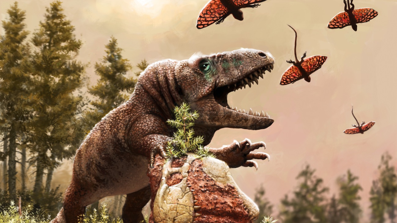 Beeld: Een erythrosuchide (verwant aan krokodillen en dinosauriërs) probeert een zwevend reptiel te pakken in een heet en droog landschap. © Henry Sharpe