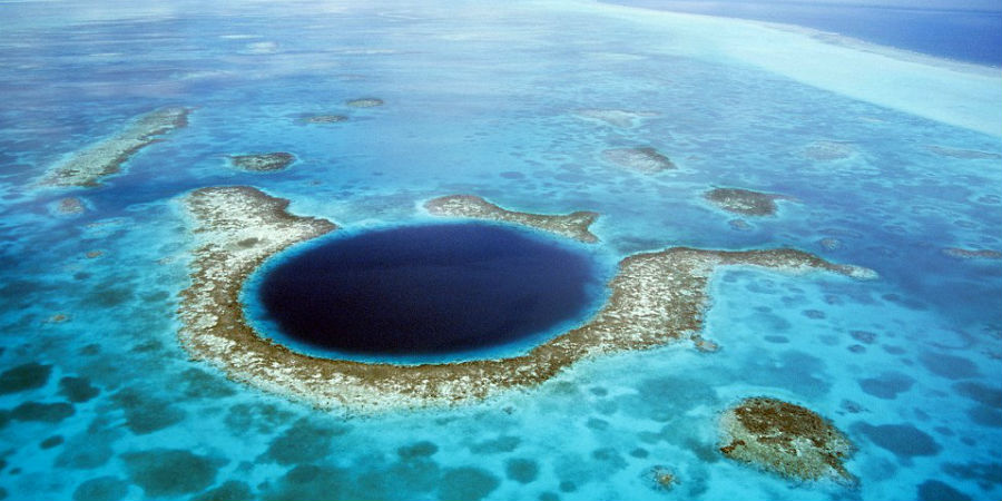 Great Blue Hole, in de Caribische Zee bij Belize. Een gapend gat in de zeebodem van 300 meter doorsnee biedt toegang tot een onderwatergrot van 124 meter diep. Dit zinkgat ontstond op land, maar kwam onder water te staan na de laatste ijstijd, toen de zeespiegel steeg. De Great Blue Hole is populair bij duikers.