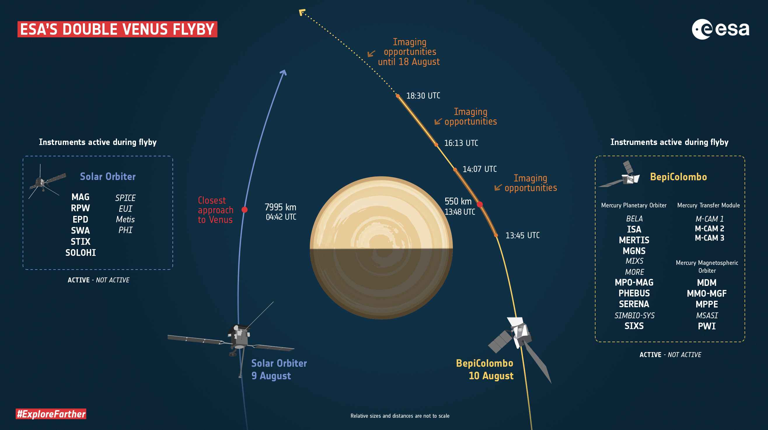 Maandagochtend 9 augustus (6:42 Nederlandse tijd) passeert eerst ‘zonnesonde’ Solar Orbiter van Europese en Amerikaanse ruimtevaartorganisaties de ESA en de NASA het Venusoppervlak. De volgende dag, dinsdag 10 augustus om 15:48, komt ook BepiColombo, van de ESA en Japanse ruimtevaartorganisatie (JAXA), een vluchtig bezoek aan de buurplaneet brengen.