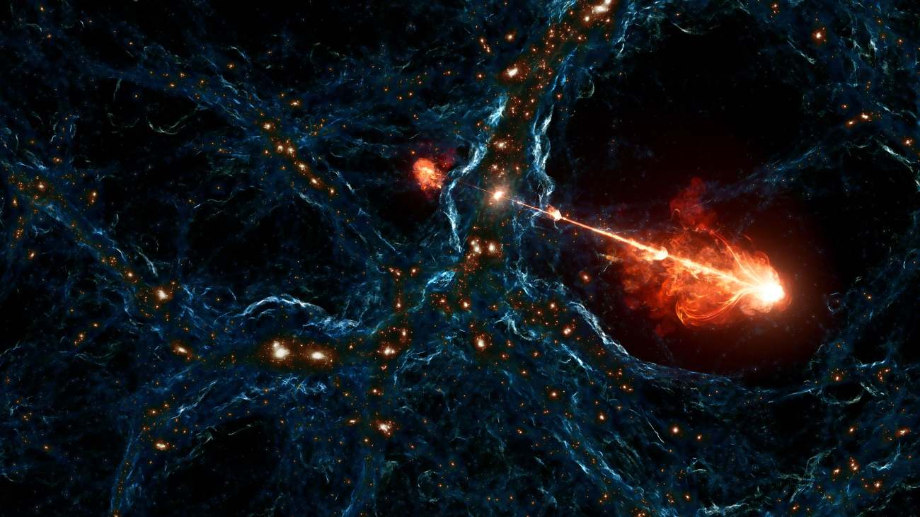De nieuw ontdekte jets zijn dus de grootste ooit. Ze moeten zijn weggeschoten bij een superzwaar zwart gat in het centrum van een sterrenstelsel toen het heelal zo’n 6,3 miljard jaar oud was. De onderzoekers gaven de megastructuur de naam Porphyrion, naar een reus uit de Griekse mythologie.