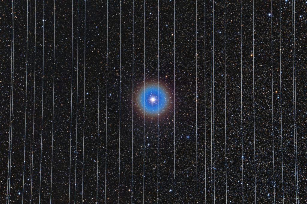 Satellieten zijn meestal uitgerust met zonnepanelen om de instrumenten aan boord van elektriciteit te kunnen voorzien. Vooral tijdens de de eerste uren voor zonsopgang en de eerste uren na zonsondergang kaatsen die licht terug naar de aarde. Dat licht is soms even helder als Saturnus of Jupiter, twee van de helderste objecten aan het nachtelijke firmament. Daardoor verstoort het de opnamen met een lange belichtingstijd die gemaakt worden door telescopen. Starlink-satellieten bijvoorbeeld, die als een soort treintje op 550 kilometer hoogte rond de aarde schieten, (zie foto hieronder), trekken lange lichtsporen over de opnamen.