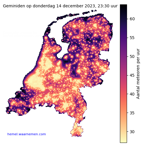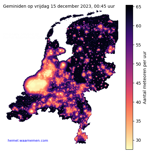 In de nacht van donderdag 14 op vrijdag 15 december vindt het maximum van de meteorenzwerm de Geminiden plaats. Op het hoogtepunt zijn er 65 meteoren per uur te zien.
