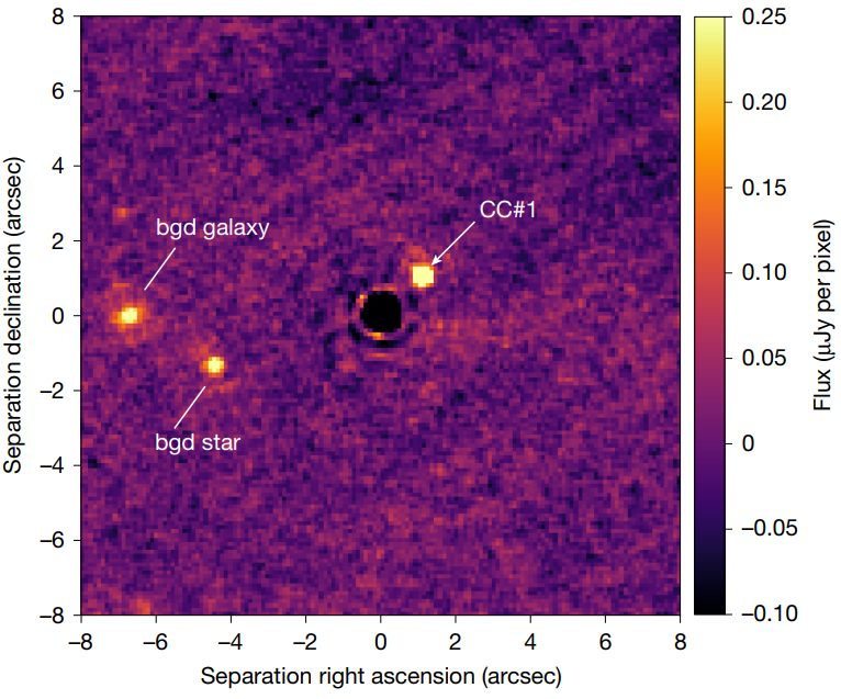 Met James Webb is dat nu mogelijk wel gelukt. Het MIRI-instrument van de telescoop heeft een coronagraaf. Dat is een apparaat dat een zonsverduistering kan nabootsen: het blokkeert het licht van de ster waardoor zwakkere objecten eromheen beter te zien zijn.