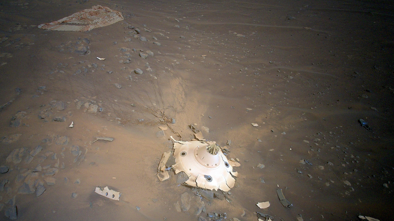 Na een reeks spannende manoeuvres, landde Marsrover Perseverance 18 februari 2021 veilig op het oppervlak van onze rode buurplaneet. Deze succesvolle touchdown dankt het wagentje onder meer aan de parachute en het kegelvormige omhulsel. Die shell beschermde Percy tijdens de barre tocht door de ruimte en de vurige afdaling naar Mars. NASA’s helikoptertje Ingenuity nam onlangs een kijkje op de crashsite van het omhulsel en de parachute.