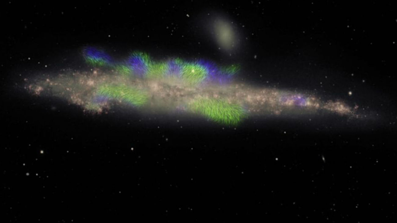 De foto is een samengesteld beeld en toont het zijaanzicht van NGC 4631. Maar het verbluffende beeld laat ook iets anders zien: een soort kosmische haarlokken rond de randen van de schijf van het stelsel. Deze filamenten tonen het magnetische veld van het sterrenstelsel dat zich uitstrekt in zijn halo, en is nog nooit eerder direct waargenomen.