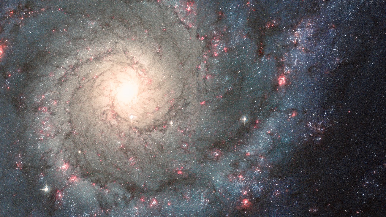 Messier 74, of M74, moet wel een van de meest fotogenieke sterrenstelsels zijn. Het bevindt zich op een afstand van 32 miljoen lichtjaar van onze aarde in de richting van het sterrenbeeld Vissen, en bevat miljarden sterren. Ook zijn er veel wolken van gloeiend gas aanwezig, zogeheten HII-gebieden, waarin stervorming plaatsvindt. Die rode, gloeiende ‘vlekjes’ op de foto – waterstofatomen die licht uitzenden – tonen de vorming van nieuwe sterren.