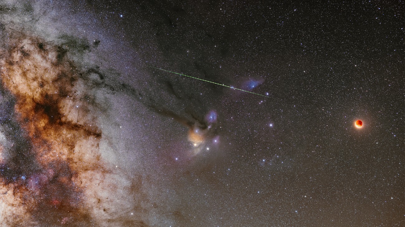 De timing om een maansverduistering vast te leggen is heel precies. Ben je te vroeg of te laat? Dan is de maan zo fel dat je foto overbelicht raakt. Hiertussen zit een kort tijdsbestek waarin het enige licht dat op het maanoppervlak valt zonlicht is dat door de atmosfeer van de aarde is gefilterd. Hierdoor krijgt het een rode kleur. Het is dus heel toevallig dat juist op dit moment een meteoor (de groene streep op de foto) langskwam. Toeval waar Dascalu laatst de Astronomy Picture of the Day mee verdiende.