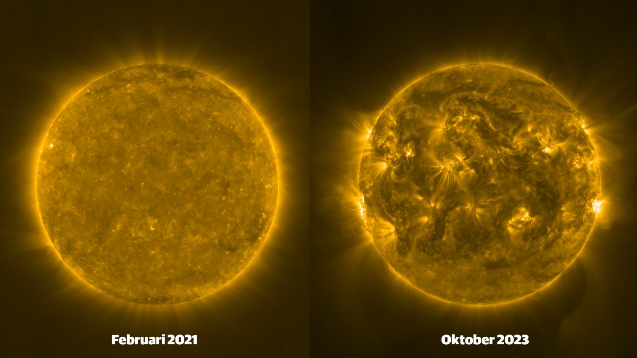 Tijdens de elf jaar durende zonnecyclus wisselt de activiteit van het magnetische veld dus van laag (zonneminimum) naar hoog (zonnemaximum). Die activiteit wordt in de gaten gehouden door de Solar Orbiter. Deze grote observatiesatelliet maakt beelden met ultraviolet licht, wat niet zichtbaar is voor een menselijk oog. Later wordt de gele kleur digitaal toegevoegd om de zonneactiviteit beter te visualiseren.