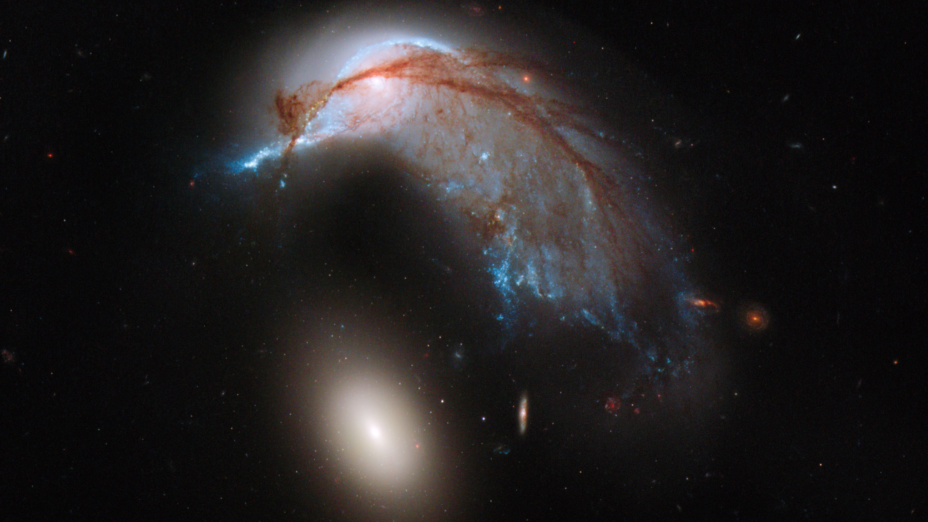 Dit gewelddadige tafereel wordt veroorzaakt door zijn eivormige buur, NGC 2937. Dit elliptische sterrenstelsel lijkt misschien klein, maar zijn zwaartekracht is enorm sterk. Het duo, dat samen ARP 142 wordt genoemd, vervormt steeds meer, maar NGC 2936 lijkt er het meest last van te hebben. Over ongeveer een miljard jaar zullen deze twee stelsels waarschijnlijk samensmelten tot één geheel.