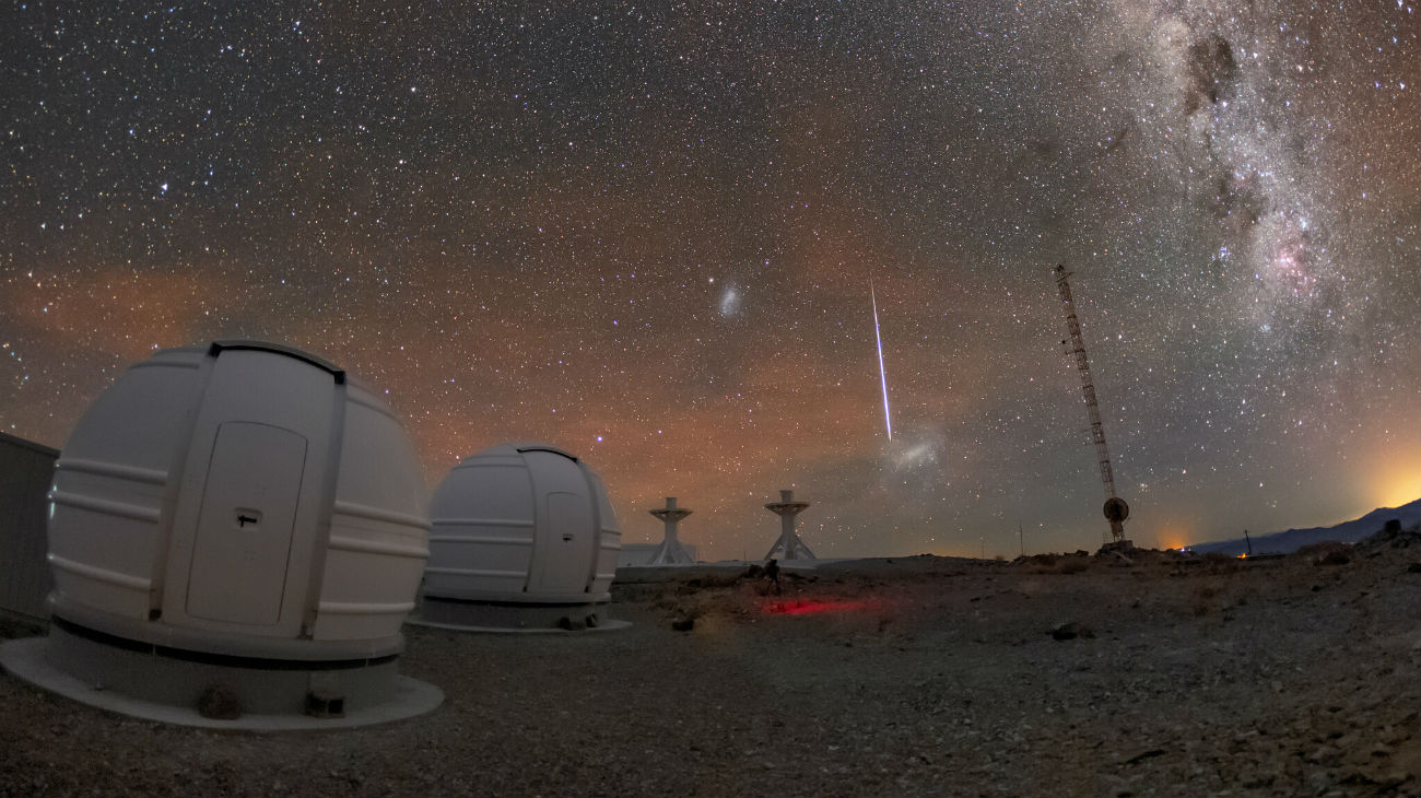 De nieuwe ExTra-telescopen in de Atacama-woestijn in Chili mochten afgelopen week een wens doen; een vallende ster flitste namelijk boven ze door de nachtelijke hemel. En alsof dat niet genoeg is voor een spectaculaire foto, laat de Melkweg zich ook nog eens van zijn beste kant zien op deze plaat:
