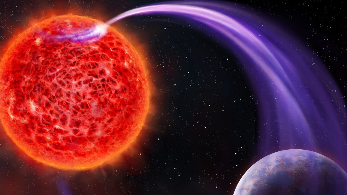 Beeld bovenaan: Artistieke impressie van een planeet (rechts) vlakbij een rode dwergster (links), met fel poollicht doordat de planeet met zijn magneetveld door geladen deeltjes van de ster ploegt. © Danielle Futselaar/Artsource.nl
