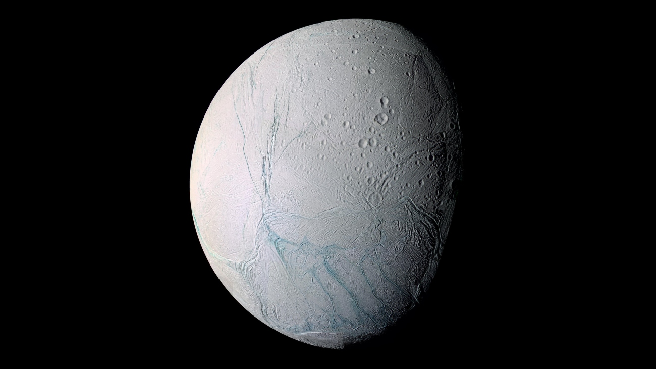 Enceladus heeft een grote oceaan van vloeibaar water dat verborgen ligt onder een ijzige korst. Regelmatig schieten geisers met grof geweld waterpluimen door de ijskorst heen en die voeden de E-ring van Saturnus met ijzige deeltjes.