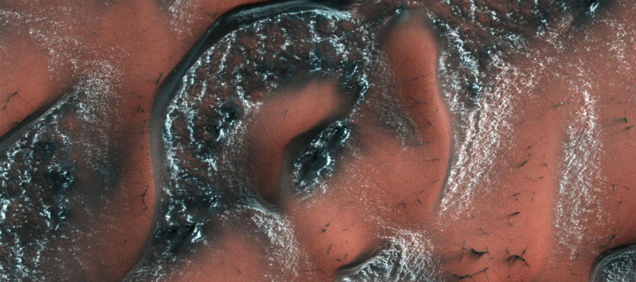 In de winter verspreidt een laag sneeuw en ijs zich over de heuvels van de Marsduinen. Dat is ander ijs dan waar wij op aarde op schaatsen. Het gaat hier om droogijs, de vaste vorm van koolstofdioxide. Wanneer de zon begint te schijnen in de lente, breekt het ijs en ontsnapt er gas uit de duinen en wordt donker zand omhoog gestuwd.
