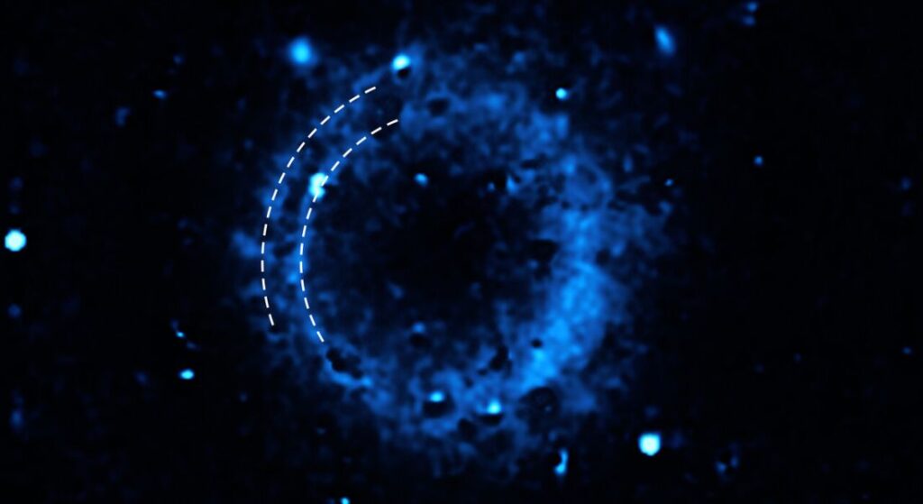 Astronomen hebben deze specifieke vingerafdruk nu aangetroffen in de overblijfselen van supernova SNR 0509-67.5. Op de foto hieronder is met stippellijntjes aangegeven waar de twee schillen te zien zijn.
