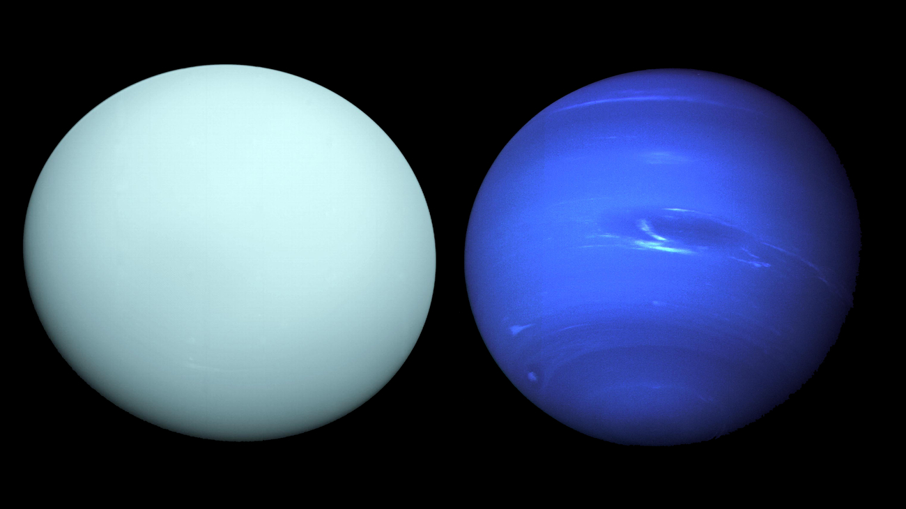 Als er twee planeten op elkaar lijken dan zijn het wel Uranus en Neptunus. Ze hebben ongeveer dezelfde grootte en massa, een vergelijkbare samenstelling en structuur, en zelfs hun rotatietijd komt overeen. Én: ze zijn allebei blauw. Maar waar Neptunus een heldere hemelsblauwe tint heeft, is Uranus vaag grijsblauw gekleurd.