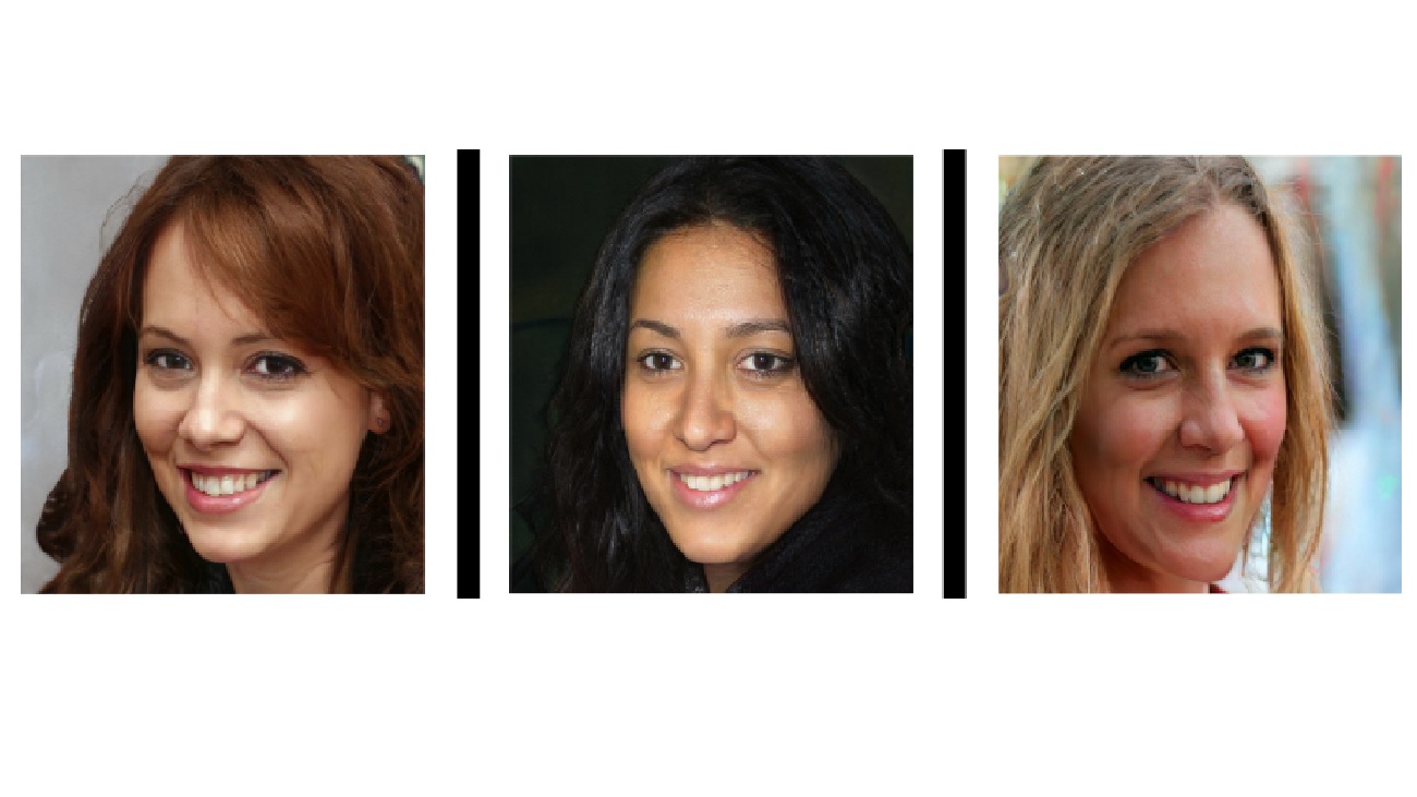 Knappe dames hè? Op de foto hierboven. Je zou een van hen zomaar tegen het lijf kunnen lopen in de supermarkt of als je een blokje om gaat. Toch is die kans zeer klein. Alle drie de vrouwen bestaan namelijk niet. Door zelf zeer korrelige foto’s in te vullen, heeft een A.I.-netwerk ze gecreëerd.