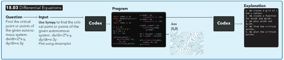 Zoals zo veel AI draait de kunstmatige wiskundestudent van Drodi op patroonherkenning. Zo gaven de onderzoekers OpenAI Codex bergen vraagstukken uit wiskundevakken bij MIT te lezen. Ook kreeg het programma de opdrachten in de programmeertaal Python te zien waarmee je vergelijkbare vragen oplost. Zo leert het welke tekst er bij een vraag hoort.