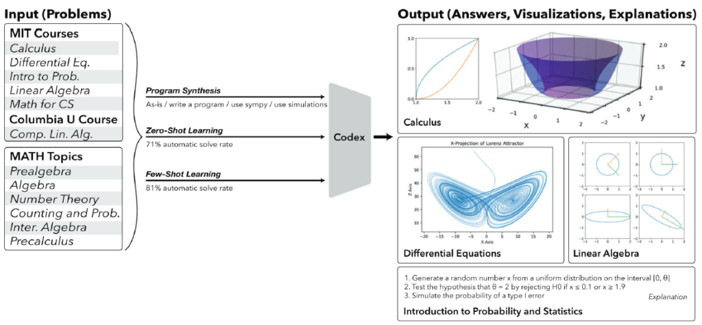 De soorten wiskundeproblemen die OpenAI Codex op kan lossen, van getallen doorrekenen tot grafieken tekenen. © Drori et al. / PNAS
