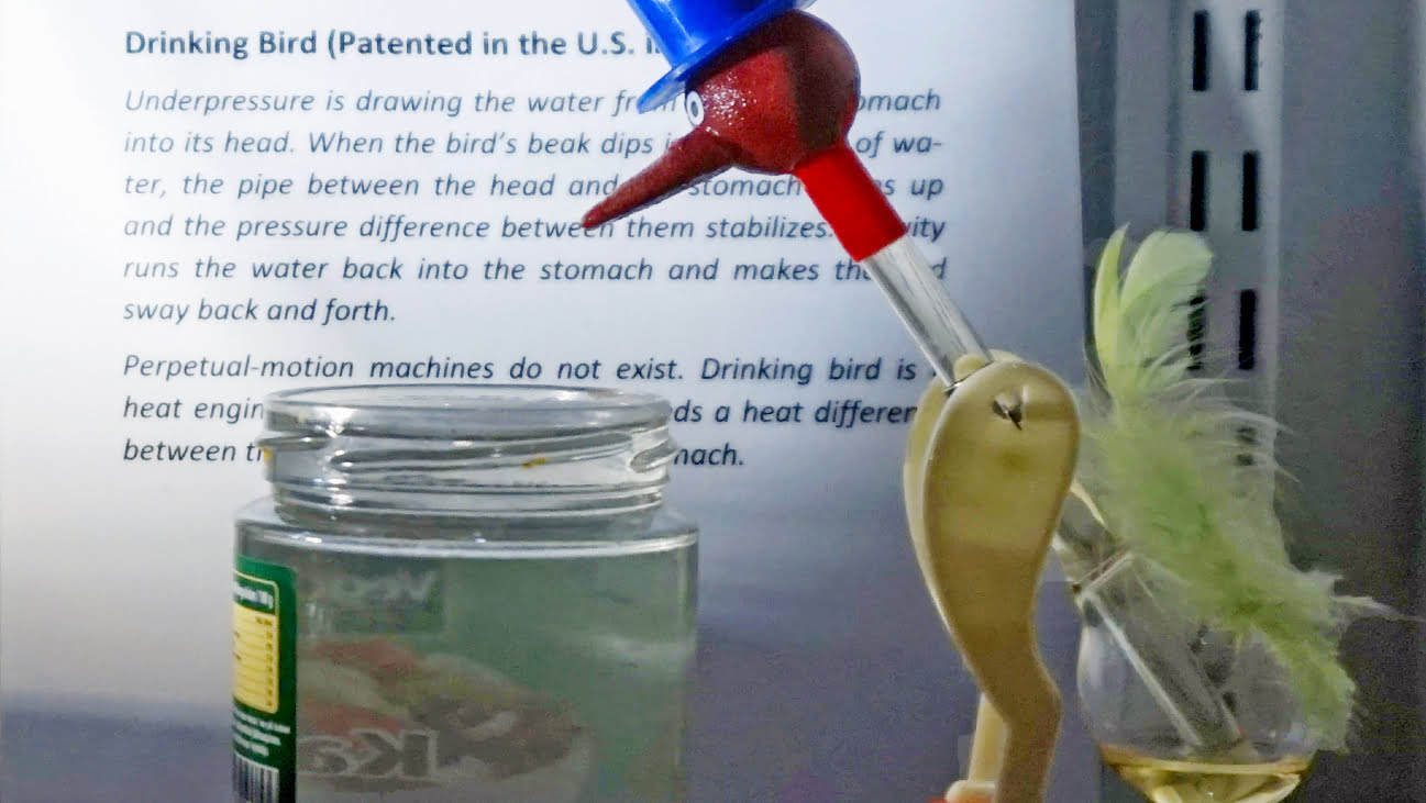 Daarin lijkt het vogeltje wel een beetje op een pepetuum mobile, een apparaat dat uit zichzelf blijft bewegen en schijnbaar uit het niets energie opwekt. In werkelijkheid blijkt het natte snaveltje van de vogel de oplossing van het raadsel te zijn.
