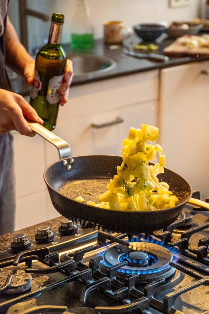 Dat de Effium-pan extra heet wordt, komt naast de kooktijd ook de smaak ten goede. Surya Prakash: “Champignons schroeien bijvoorbeeld sneller dicht, waardoor ze minder vocht verliezen en hun smaak beter behouden.” En vlees en vis worden krokanter van buiten, maar blijven mals van binnen. In restaurants gebruiken chef-koks vaak krachtige gasfornuizen om dit soort effecten te bereiken, maar met de Effium-pan lukt dat ook op een normaal fornuis.
