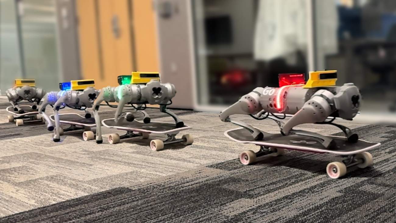 Een viervoetige robot laat in een filmpje zijn skatekunsten zien. Met een skateboard rolt de robothond door zowel een kantoor als skatepark.