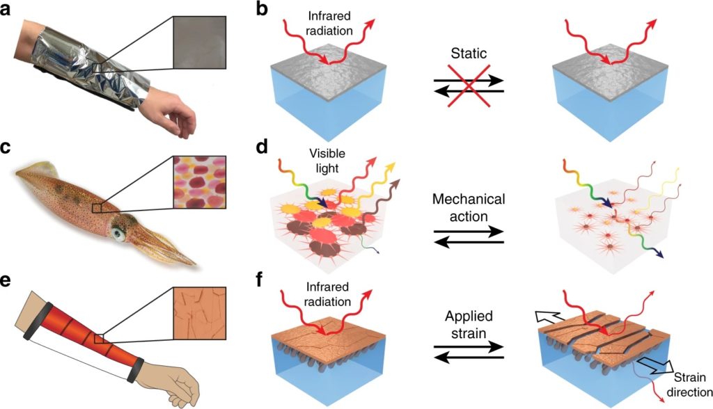 Op basis daarvan kwam het Amerikaanse team met een composietmateriaal met daarin een soort eilandjes van bepaalde metalen, bijvoorbeeld koper. “Als het materiaal niet onder spanning staat, liggen die metalen eilandjes in ons composietmateriaal naast elkaar. Ze komen verder van elkaar te liggen als je het materiaal uitrekt, en zo kun je de reflectie en doorgifte van infrarood licht of de warmteafvoer regelen,” aldus Gorodetsky.