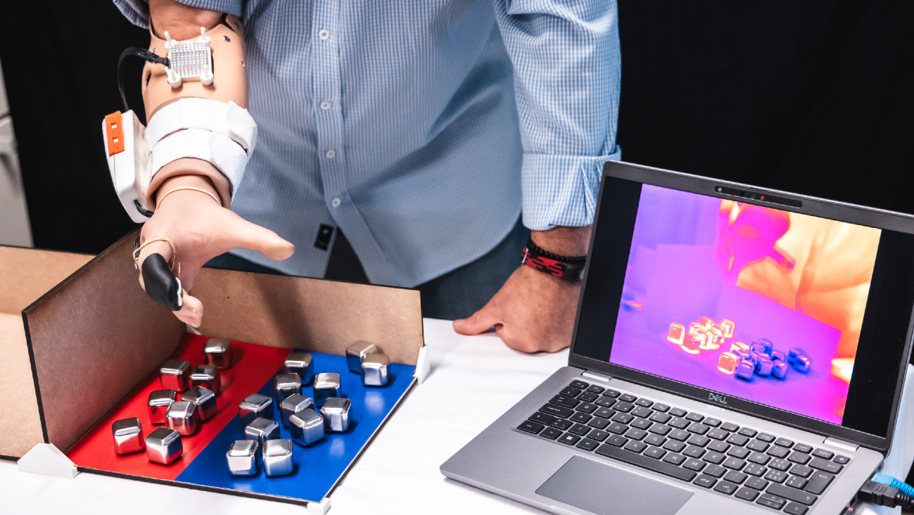 Dankzij een apparaatje op een prothese kan een persoon met een missende ledemaat toch de temperatuur van objecten en personen voelen.