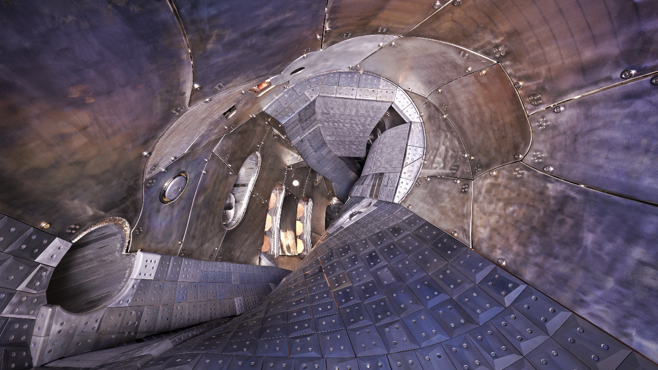 Maar er zijn meer dan honderd experimentele fusiereactoren, verspreid over de hele wereld. Een heel bijzonder exemplaar is Wendelstein 7-X, in het Duitse Greifswald. Veel minder symmetrisch dan de meeste van zijn concurrenten, want het ontwerp komt uit de koker van een supercomputer, die feitelijk als opdracht had: ‘Bedenk de ideale kernfusiereactor, maakt niet uit hoe hij eruitziet.’ En dan krijg je dus een machine die aan de binnenkant niet oogt als een strakke hightech-faciliteit, maar als een grillige grot, bekleed met roestvrij stalen platen.