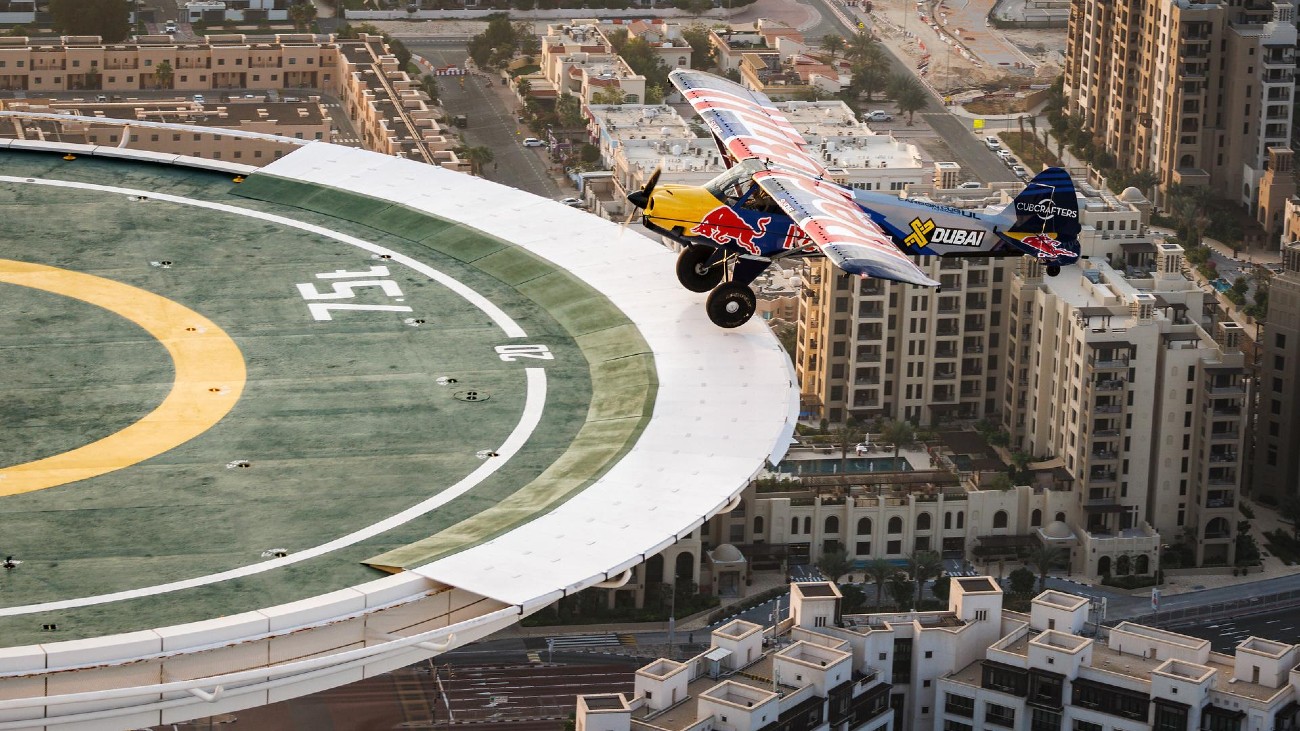 Toch had hij drie pogingen nodig om net op tijd tot stilstand te komen op het helikopterplatform van het Burj Al Arab-hotel. Bij die geslaagde poging remde het 7,1 meter lange en 10,44 meter brede toestel pas na 20,76 meter. Heel veel speling hield de piloot niet over; de lengte van het heliplatform is namelijk 27 meter. De landing werd op 14 maart uitgevoerd in opdracht van energiedrankproducent Red Bull die wel vaker gewaagde marketingstunts uithaalt.
