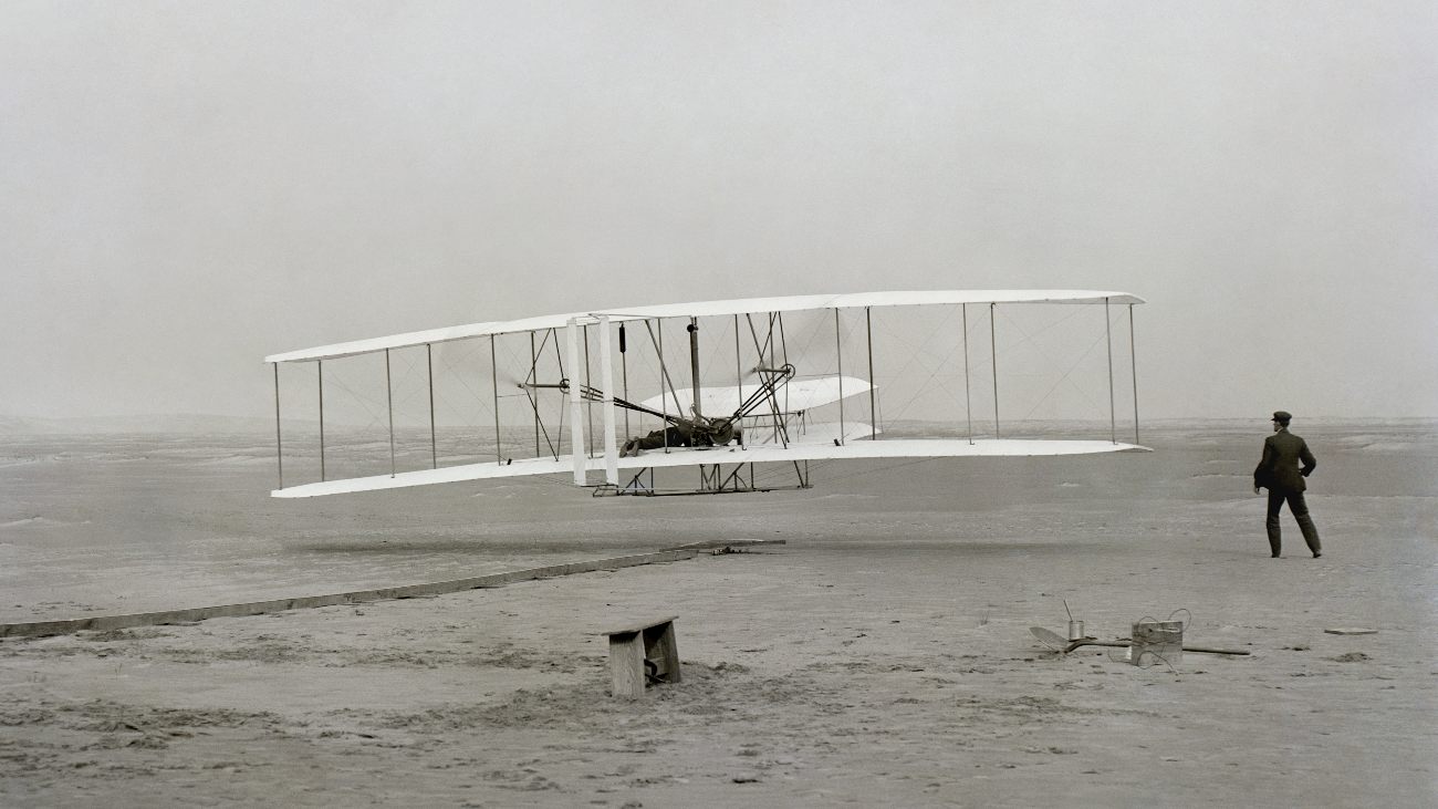 Op een koude en winderige dag in North Carolina in de Verenigde Staten kwamen jaren van ontwikkeling tot uiting in de allereerste gestuurde en gemotoriseerde vliegtuigvlucht ooit. Orville Wright vloog The Wright Flyer op 17 december 1903 voor het eerst de lucht in terwijl zijn broer en mede-ontwikkelaar van het vliegtuig, Wilbur Wright, toekeek vanaf de grond.